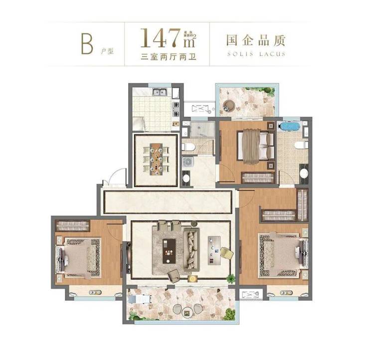 以建面147㎡三室两厅两卫为例,四开间朝南的设计,让全屋拥有通透的采光和通风;当下流行的大横厅,让整体空间更加阔绰;主卧套房设计,私密性更佳;北向次卧连通阳台,舒适度毋庸置疑。