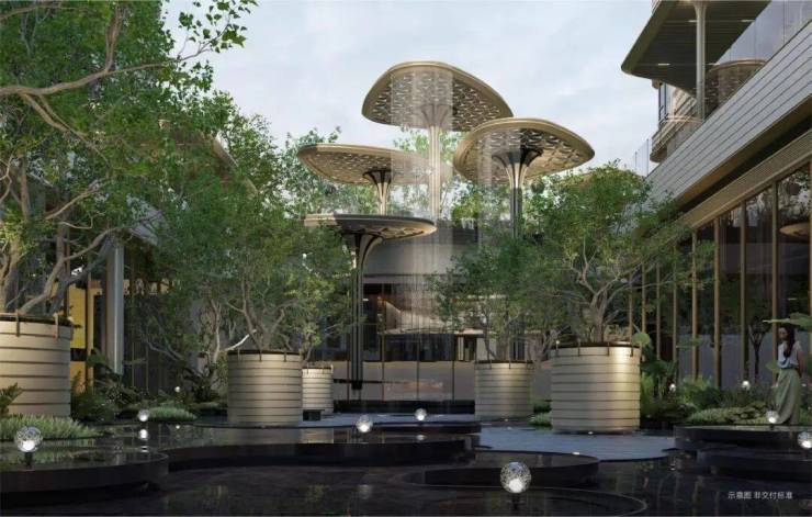 ◎浮岛美学园林:以“林岛漫步、循水归岸”动线造归家仪式感,“叠水—镜面—汀步”立体水网呼应外部水系,连廊串联架空层与景观,实现自然与生活无界。