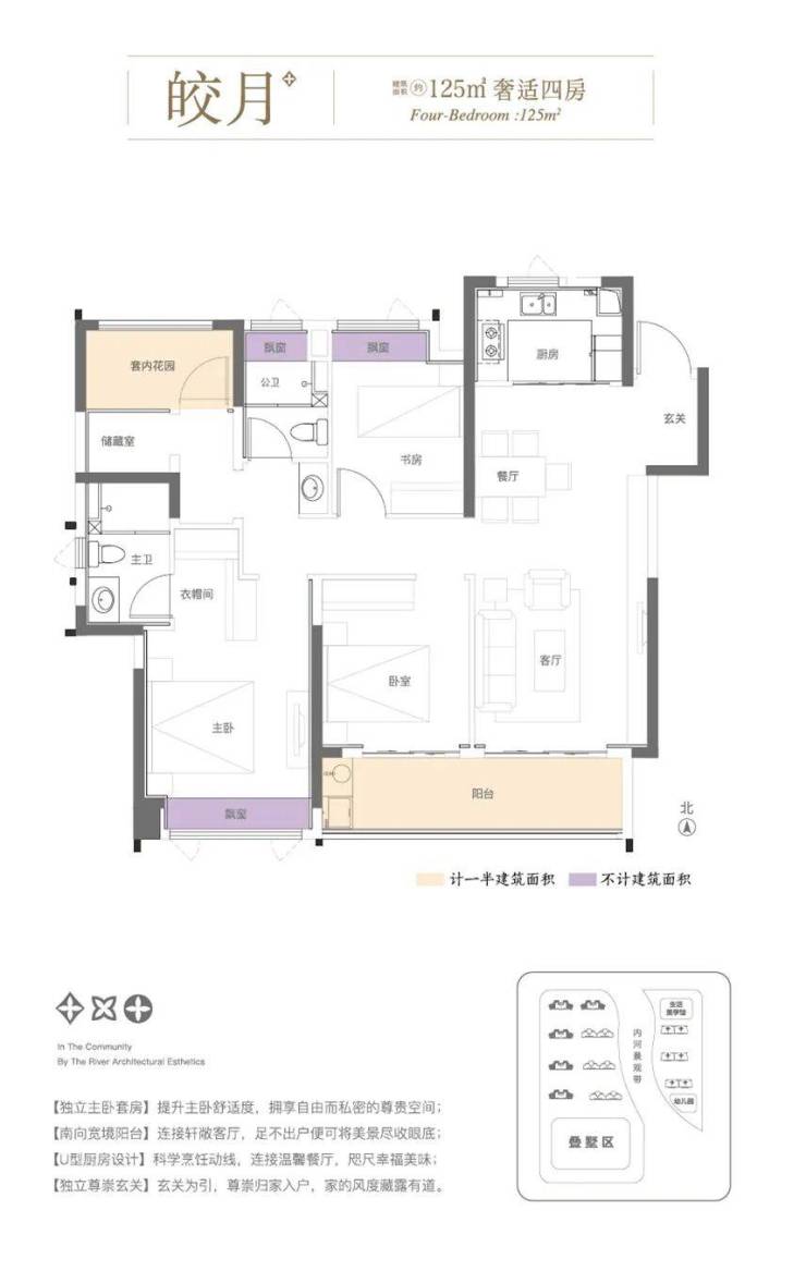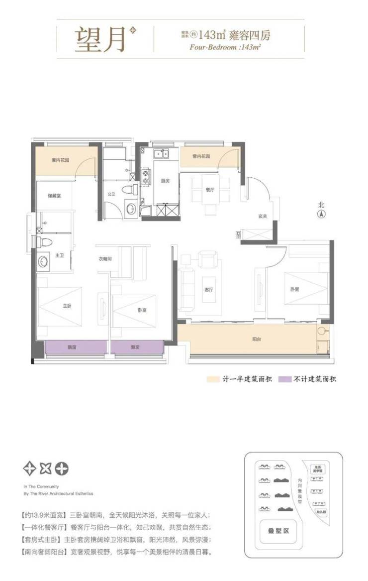 户型设计:高层主力户型为105-143㎡,涵盖三房至四房,注重南北通透、大面宽采光及景观阳台设计;叠墅产品以约170㎡风雅叠墅为主,强调空间层次与自然融合。