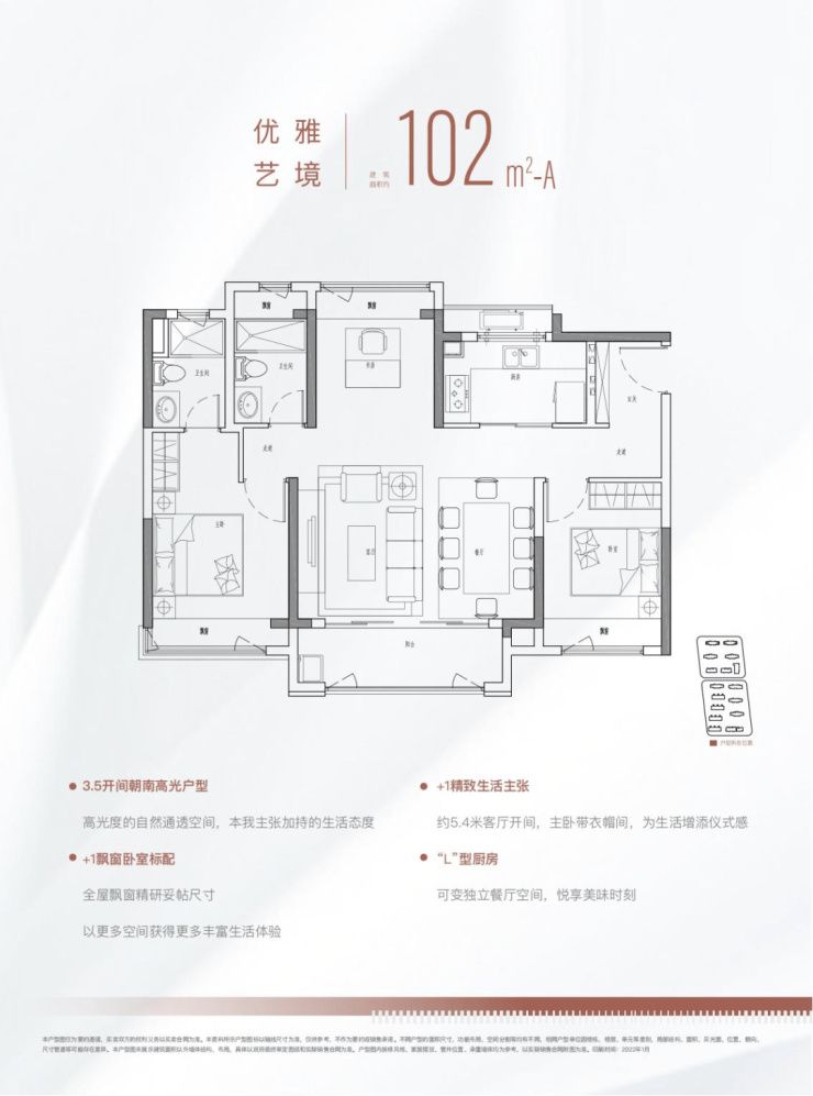 102㎡三房两厅两卫的舒适户型,约5.4m横厅设计,3.5开间朝南,得房率约80%左右(*该得房率仅供参考,最终以开发商官方数据为准);每间房均有飘窗,全屋飘窗共享有额外的面积约13㎡(*此处面积仅供参考,最终以开发商官方数据为准)在市场上也是少有的产品。