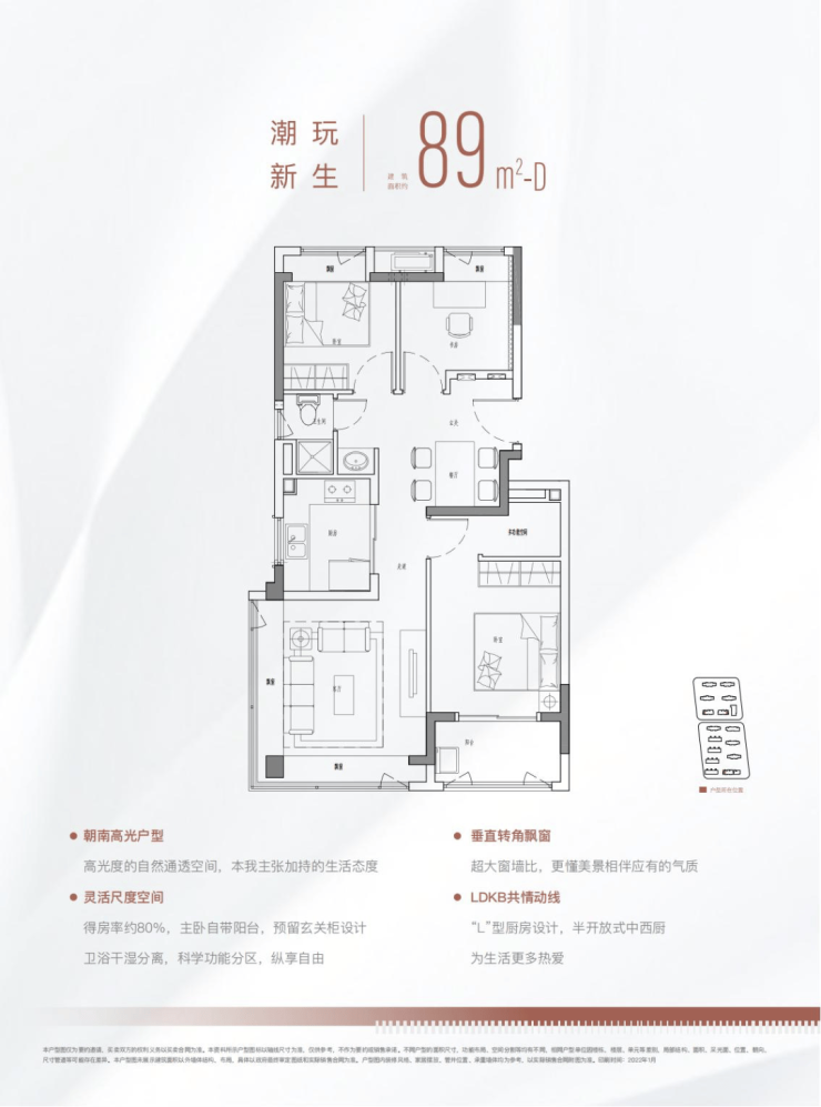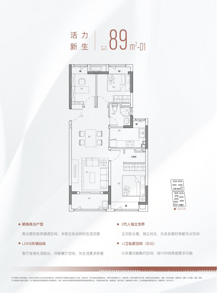 89㎡ 3房2厅2卫(规划)功能户型,入户洗手台规划设计,为业主在疫情常态化的新生活提供更健康的居家生活方式。