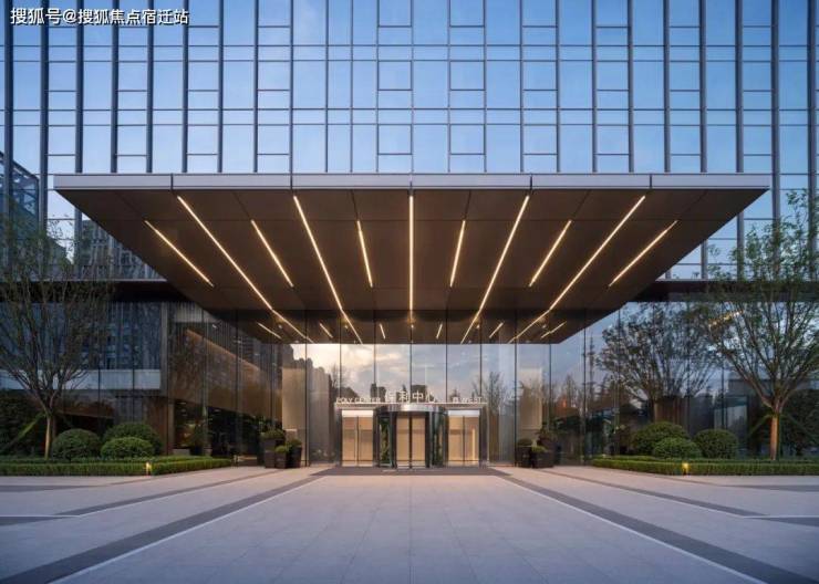 大堂入口专业互嵌,一体化设计。办公入口室内采用10m挑高的大堂,室外雨棚悬挑8.25m,结构设计采用7条管桁架为主龙骨,取消斜拉杆;室内装修与建筑、幕墙、景观铺装形成一体,整体造型轻盈、和谐。