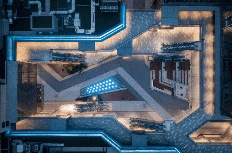 商业内街中庭核心位置设置三层超轻超薄、高通透性、高亮度、高防护等级、高对比度与广视角、耐用性强、结构简单且安装灵活的LED格栅屏;既可放映动态视频,视线又通透,点亮成焦点,关闭则融入建筑,造型统一。
