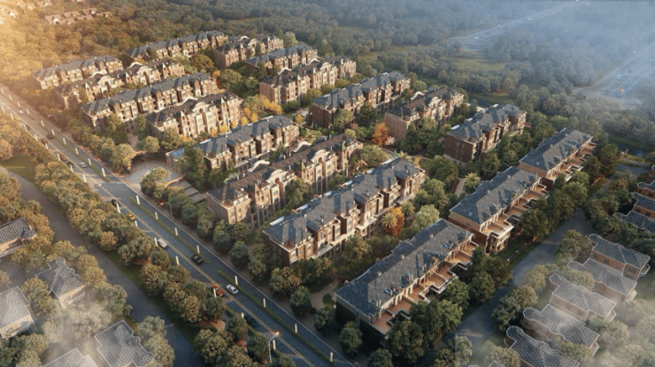 社区建筑采用欧式设计风格,外立面均为文化砖及黄金麻干挂石材打造,配备涉外别墅级草坪活动广场、下沉式露天泳池、喷泉广场,高成本打造精致又舒适的社区环境。景观则采用横纵对称设计,拥有完善的河岸景观及滨水步道。