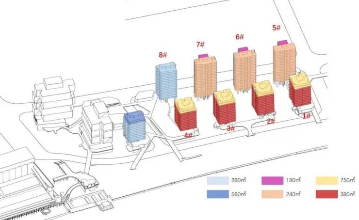 380户型总高约60米共15层,底部3层架空,高度约16米,均能获得很好的一线观江视野,通过底部架空层抬高底盘,保证临江第一排均有完整的江景视野。底盘抬高以后,每栋可以实现双入户大堂的设计,首层入户大堂净高最高约9米,二层入户大堂净高最高约4米,通过二层大堂可直接步行至社区商业,也可以通过连廊步行至滨江步道。380户型都是三梯两户设计,每栋仅有22套380户型房源。