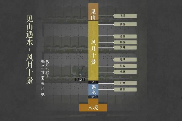 中国人自古讲究归家礼序,门第之尊;久映颂月将传统中式建筑的礼序空间融入整体的规划布局中,形成一坊八巷-置坊入巷-穿巷入户的三重归家礼序。