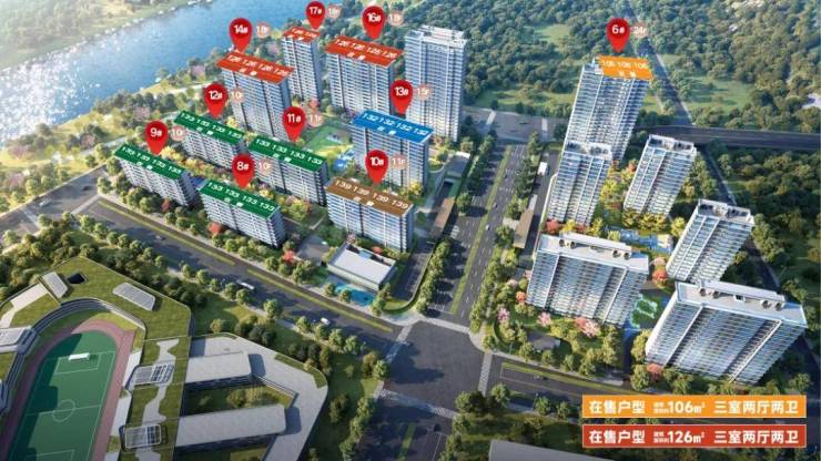 面积段(建筑面积约):106㎡三房两厅两卫、126㎡三房两厅两卫、132㎡四房两厅两卫、133㎡四房两厅两卫(洋房)