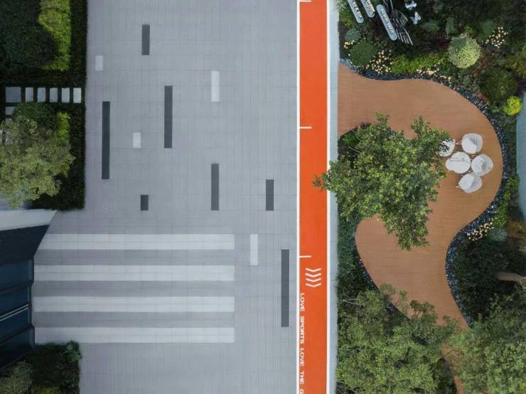 一体式健身跑道,设置跑道起跑方向、跑道标志指示,在跑道标准段,根据人体科学跑道宽度规划1300mm的距离,通过健身跑道将十余种休闲功能串联,让全年龄段的住户都能在这个运动系统中活动