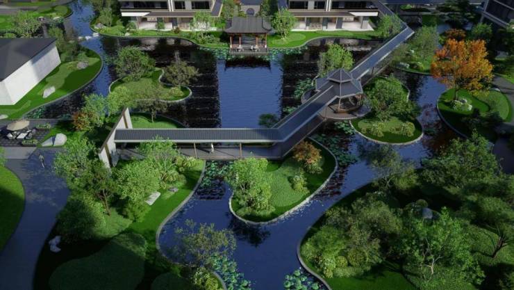 九里河、走马塘河、春丰河三条主要水系共同构成了新城独特的自然景观,滨河而居,内外双园景