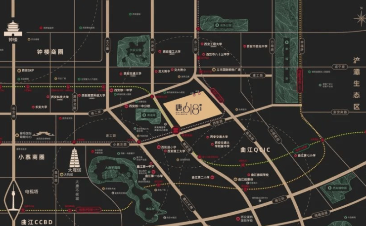 项目位于立足于曲江一期门户,身处曲江、城东、城南三区交汇位置,属于名副其实的“西安主城黄金腰带”——南二环南侧。尊踞乐游原之上的青龙寺东侧。南临西影路,东临新安路,西邻雁翔路。作为主城遗珍土地,至稀至贵,青龙寺板块发展成熟,配套优胜。