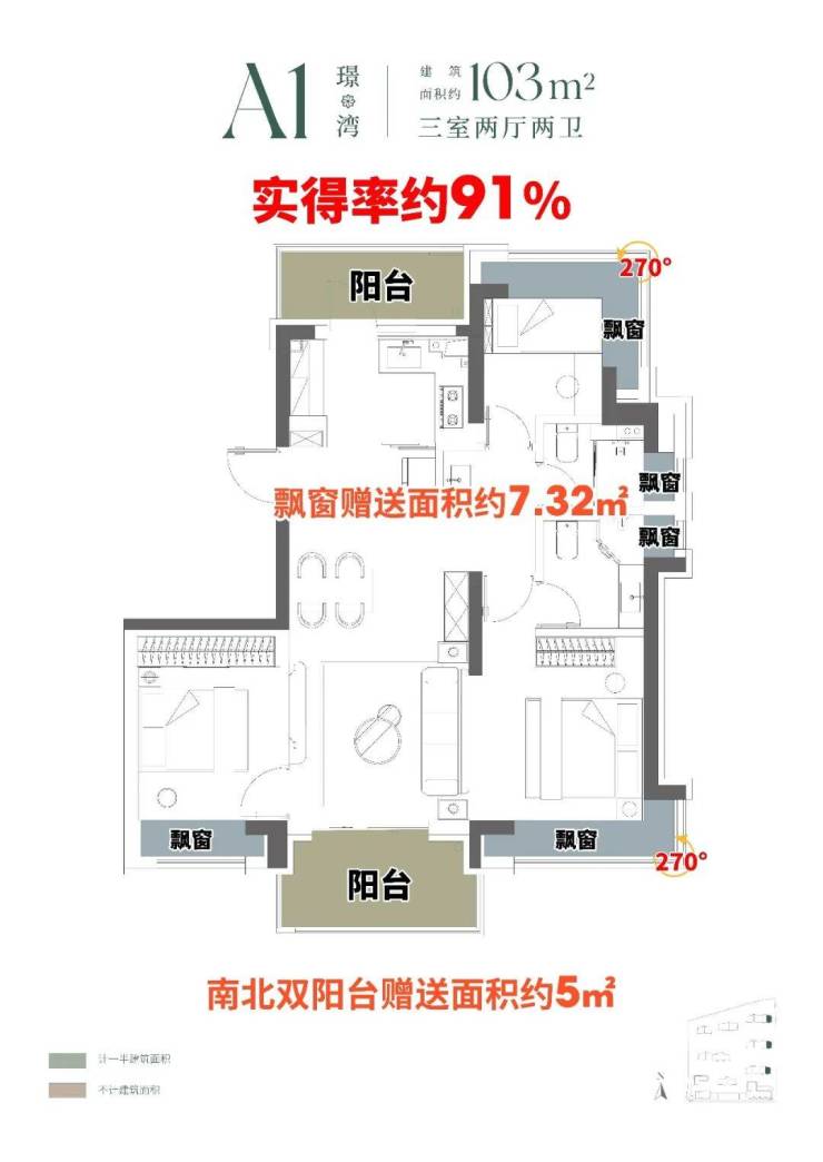 建面约103㎡A1户型,约10.47㎡南北双阳台空间,阳台“买1赠1”,赠送约5㎡,南侧观景阳台,北侧功能阳台,更附赠约7.32㎡飘窗,实得率约91%。