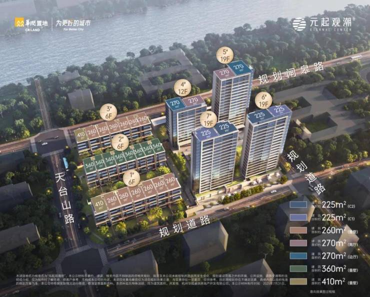 元起观潮府总占地面积约2.2万方,总建筑面积约7.8万方,规划4栋高层和3栋叠墅,容积率2.3,总户数186套。项目主力户型为高层建筑面积约225㎡、270㎡,中心叠墅建面约260㎡、360㎡、410㎡。项目凝练“元起五观三潮”领先产品体系,为杭州立序封面作品,为豪宅划时代。