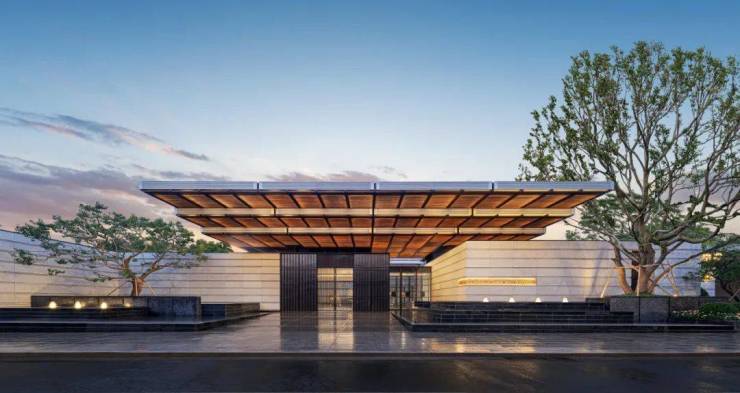 门庭礼序,从阅江楼和鼓楼建筑中汲取灵感,以屋檐三叠式设计,呈现“华盖门仪”的归园秩序,入内,仪式感单元入户大堂,铺展生活序章;多处采用经典复古格栅花窗,隔而不断,精致logo印记彰显文雅于无形。