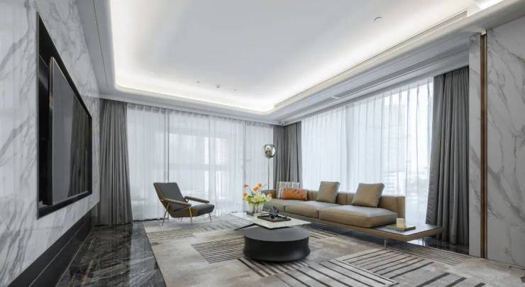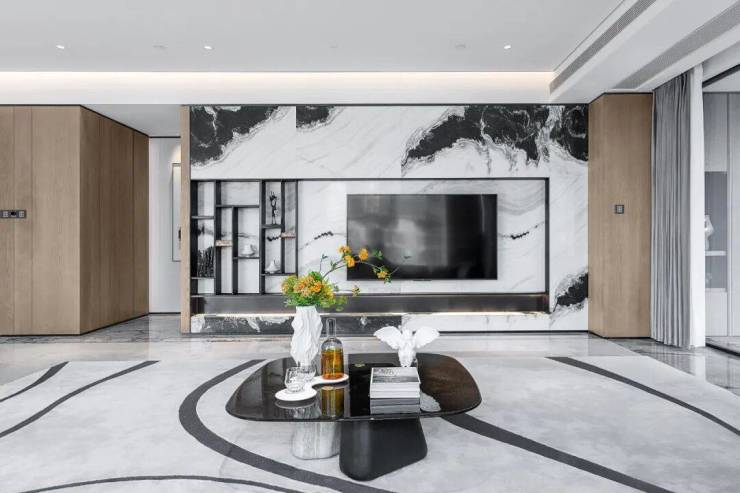 约60㎡的公区,仍是珍贵石材的主场,雅白玉满铺地面,熊猫白为背景墙,色调是柔和的白加上大朵氤氲的水墨,配合洗练的线条,摩登大户型的刚与柔,令人过目难忘。