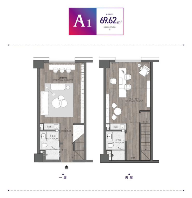 双入户,顾名思义就是把一套产品,设计成上下独立的两处空间,各自配备独立的功能分区,打破常规的产品理念,尽情发挥对空间的想象力。