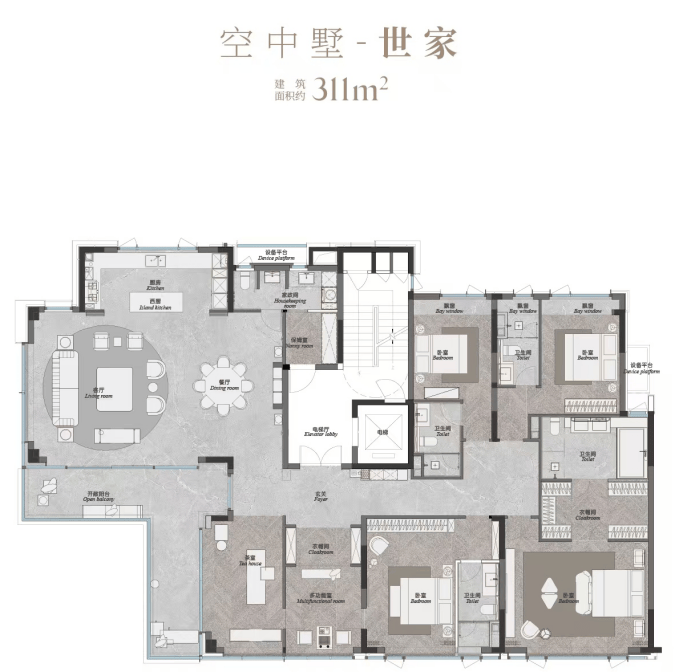 项目规划8栋7-10层低密纯洋房社区,138席建筑面积约212-311㎡墅式大平层。在场景方面,项目拥有别墅的场景,把地面院落移至空中,311㎡户型加持户外花园和空中庭院,打破室内外分隔,无界书房被花园包围,同时1梯1户的设计增加私密性与尊贵感。