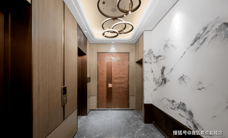 江澜云境阁的进户门,是市值十几万一扇的「定制款」,霸气、宽厚;一出门就是超大的精装电梯厅,五楼以上的楼层,每一套可以私享两部电梯。