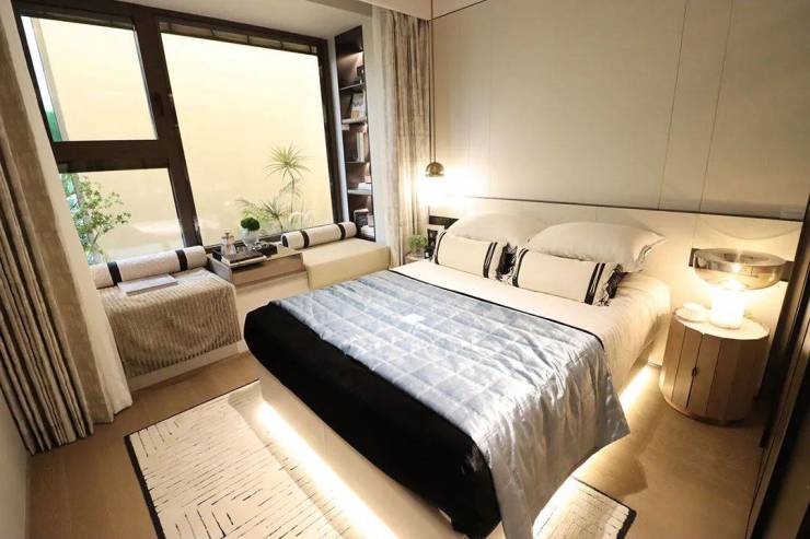 主卧套房设计,隐私性较好,飘窗设计更有效延申室内空间,也可以作为休闲区域使用,收纳空间设计的也比较充足,切实考虑年轻人买买买的购物习惯。