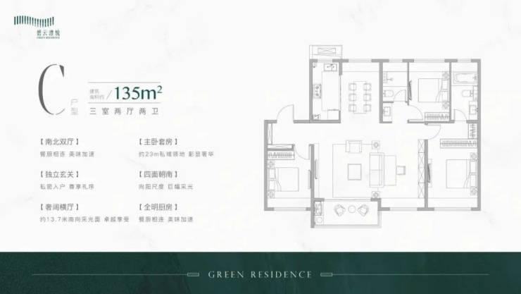 此户型可以说是改善人群非常喜欢的户型,建面约135㎡3房2厅2卫设计,动静分区,四开间朝南,各空间尺度奢阔,还有一个超大面宽的景观阳台,实现功能性和舒适度兼得。