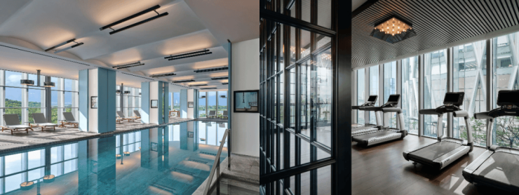 进入归家大堂,2F规划了游泳池、健身房(公建配套,未来交由政府运营)等功能性空间。
