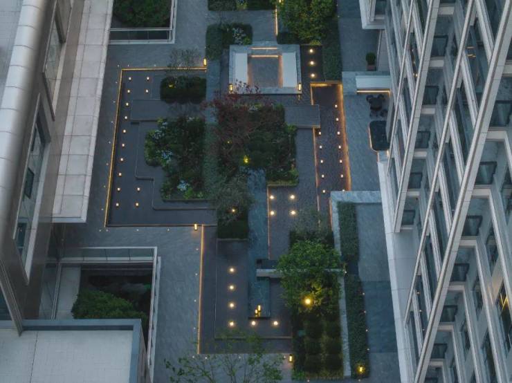 同时,社区内部景观打造了大面积的叠级水景,搭配普拉达绿大理石和浪淘沙石材,呈现整体空间的隐奢基调。