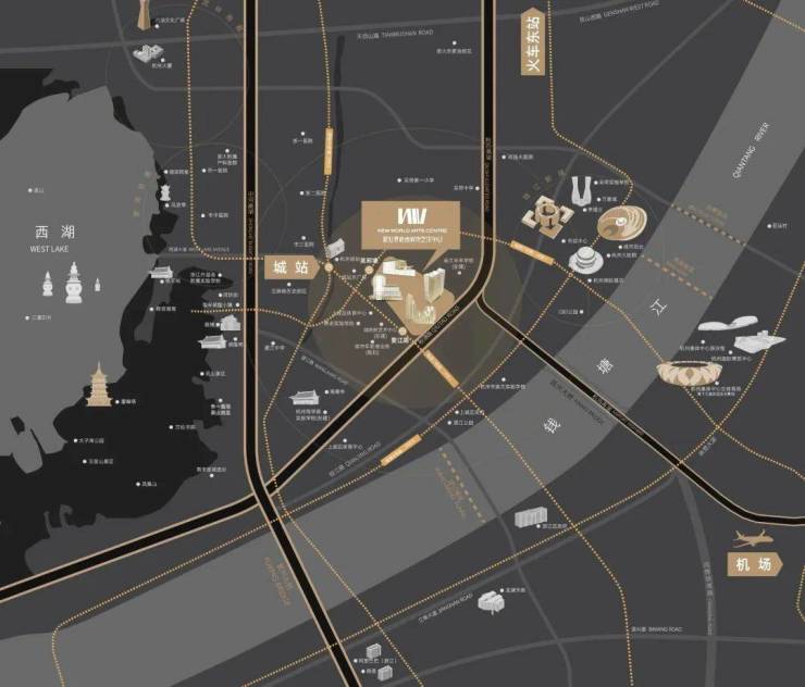 从直线距离2公里范围内的城市资源来看,这里是杭州唯一同时拥有西湖、西湖群山以及钱塘江杭州主江段的城区,这里还有中国比较稀有的城市中心的高铁站——杭州城站,此外,这里的西向即是西湖风景区、湖滨商业区以及南宋皇城小镇等文化历史景区,向东则是钱江新城,