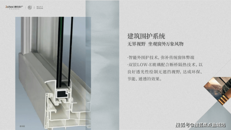 建筑围护系统,智能外围护技术,弥补传统窗体弊端。运用双银LOW-E玻璃配合断桥隔热技术,以良好透光性绘制无遮挡视野,达成环保、节能、通透的效果。