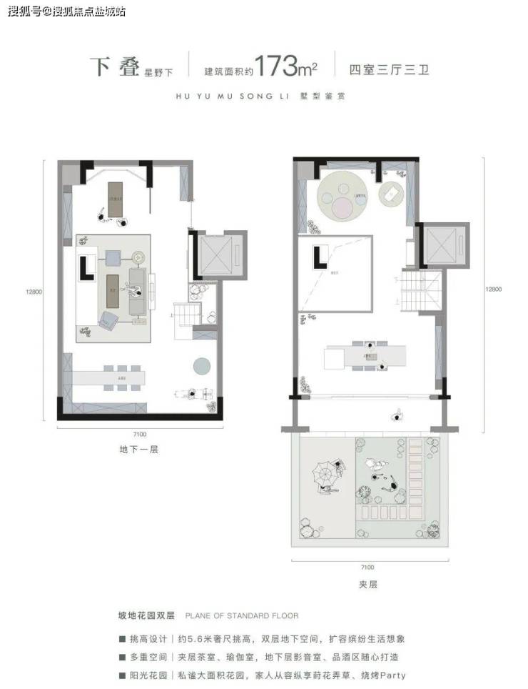 可以非常明显的看出,项目是做了双首层的概念。因为特殊的坡地处理,所以有天然的地理高差,地下层与一层自然贯通,形成两个首层,使原有“地下层”跃然平面之上,成为稀有的“阳光院落层”。