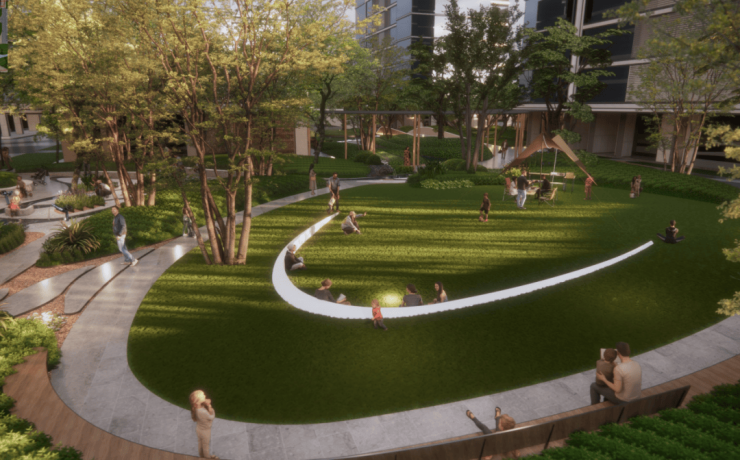 当你坐在草坪上,这条「线」可以都用来当靠背,将来业主能在这举办露天电影节、音乐节甚至园区市集。