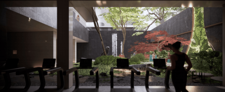 凤咏朝阳大手笔把整个园区中央位置的5号楼首层、裙房及地下,都用来做了楼盘的「艺术会所」,同样请来著名设计师吴滨操刀,里面规划了恒温泳池区、健身俱乐部、寻味厨房、文澜书院……