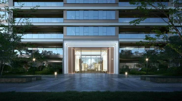 『现代化镜像立面』传承府系经典塔冠与对称美学,于立面造型上优化升级,现代美学立面进阶,以铝板及玻璃为主要材质,高窗地比营造光影美学,主材料玻璃幕墙,营造出时尚现代的氛围感,以光影哲思写意现代建筑美学。