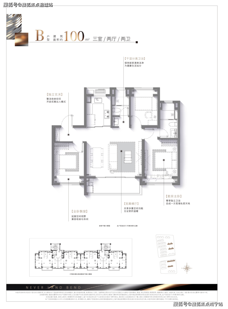 在南向三开间的基础上,该户型“创新横向宽厅,营造百平米少有的客厅尺度“打造3.5南向面宽。