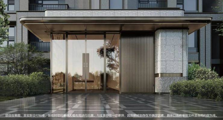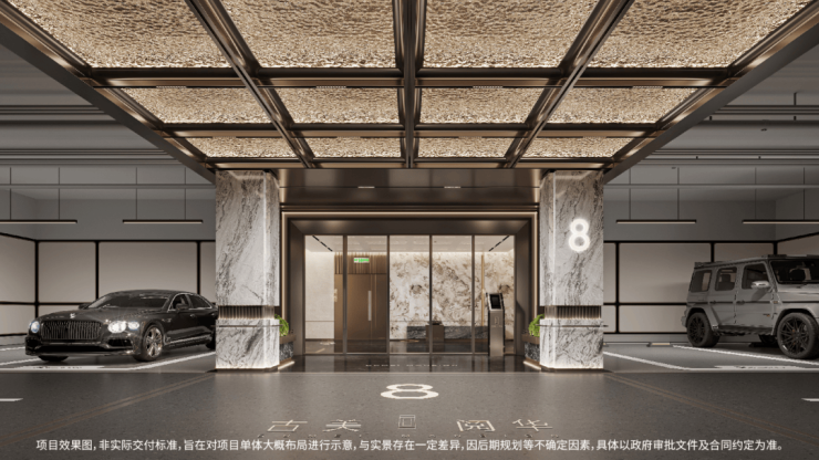 古铜色金属与水波纹质感搭配,构筑璀璨星空穹顶,模拟自然光线随时间动态舞动,光亮洁新的水磨石车道,精雕格调归家之路。