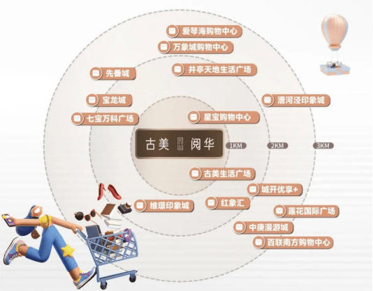 比如商业上,古美阅华周边有万象城、爱琴海购物广场、七宝万科城市广场、凯德龙之梦、南方商城、中庚漫游城等繁盛商场。