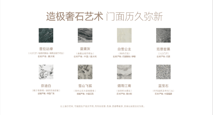 住宅基座及单元门头使用蓝宝石石材;森氧会客厅吧台使用兰黛灰。