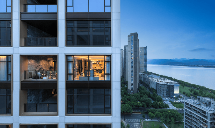以《春江花月夜》为设计灵感,“三庭四院”园林景观,对景钱塘江的诗情画意。