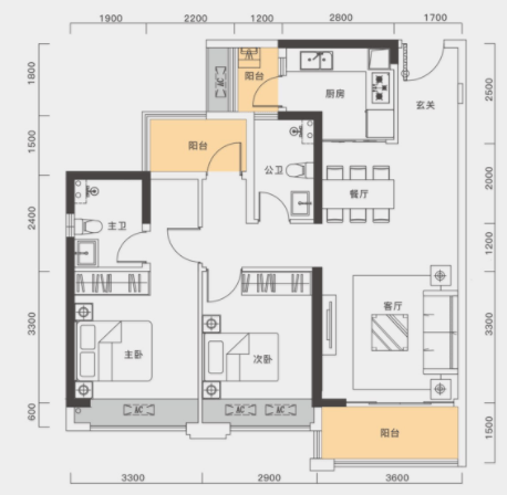 建面约97㎡为2房户型,设计中规中矩,动静分区明确,生活阳台可以往过道方向拓展,改造成第3个小房间,运用比较灵活。