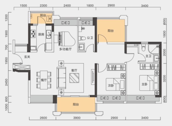 建面约111㎡有3个厅,分别为客厅、餐厅和多功能厅,多功能厅或者餐厅可改造成第三个卧室,生活阳台后期设计为书房或者小次卧,无异于市场常见的3+1房户型。
