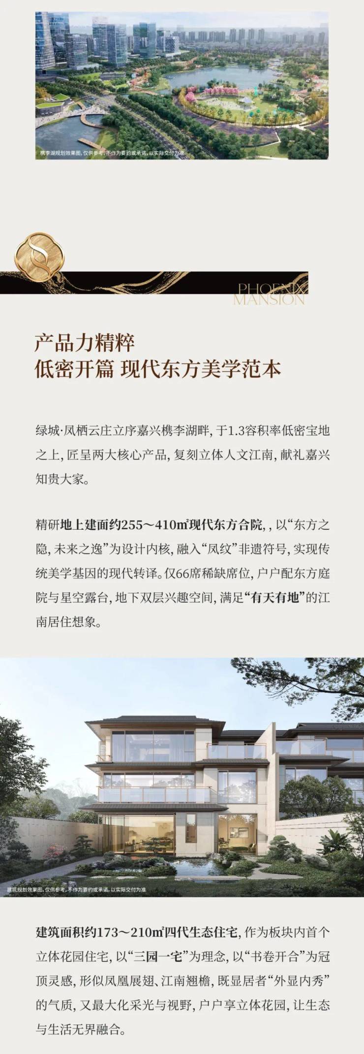 凤栖云庄位于嘉兴携李湖畔,遵循绿城低密作品“循人文、观未来、拥自然”的严苛标准,在1.3容积率的稀贵土地上,缔造现代东方人文湖墅,精研建筑面积约255-410㎡现代东方合院、建筑面积约173-210㎡四代生态住宅。