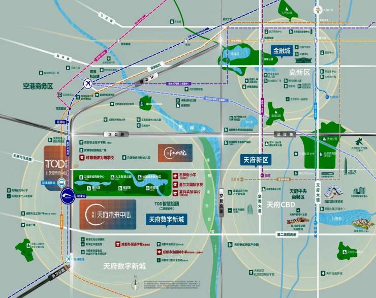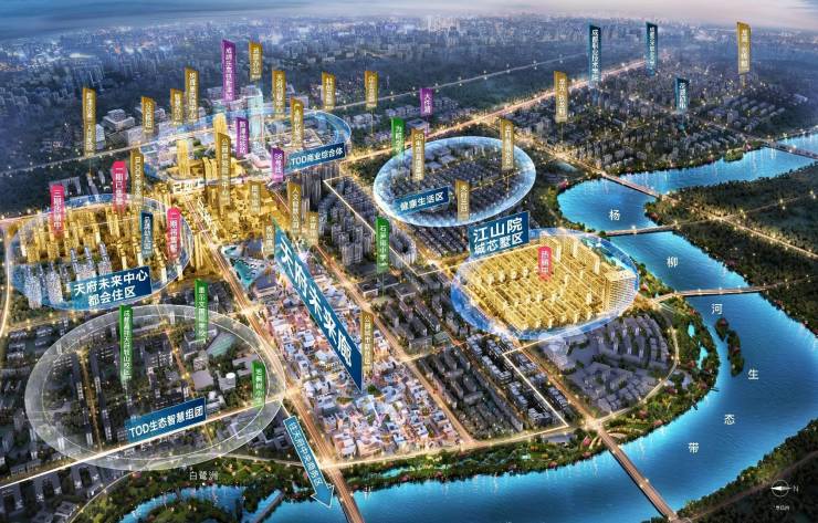 天府新区以武汉路作为东西城市中轴线,串联成都南拓版图。天府未来中心作为成都四大片区级TOD落址天府西。至此,城南形成以天府未来中心、金融城、牧山数字新城的黄金三角区发展格局。