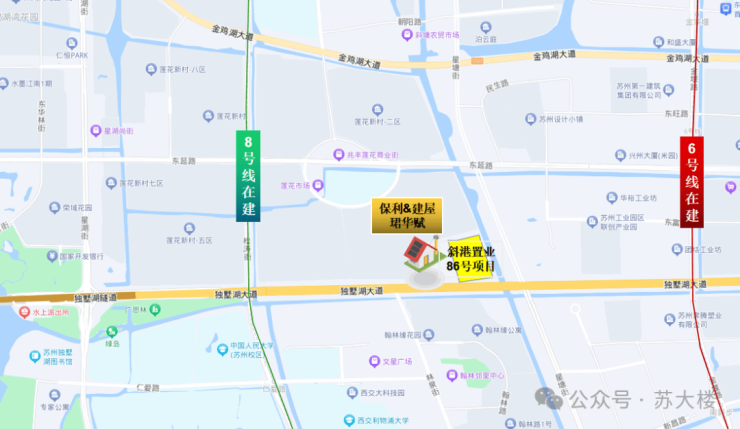 保利建屋珺华赋位于园区星塘街西、独墅湖大道北,交通上在地铁站6/8线均不远,独墅湖大道,中环东线就在附近,出行便捷。商业的话,联丰广场、翰林邻里中心、斜塘邻里中心都不远。同时项目靠近独墅湖科教区,独墅湖、大学城近在咫尺,环境优美,氛围浓厚。