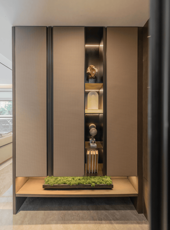 整套玄关柜都是博洛尼定制,内置感应灯、多宝格抽屉、鞋柜精灵!