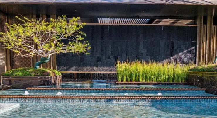 入户花园采用对称式花池和景墙设计,高定发光格栅花池,搭配丰富植被植物,随景入户,仪式感归家,潺潺水流平静心灵。