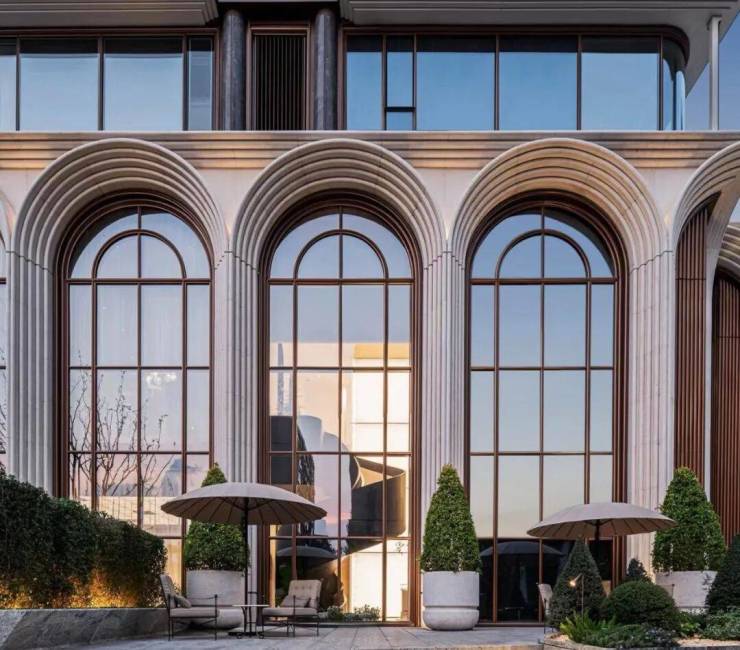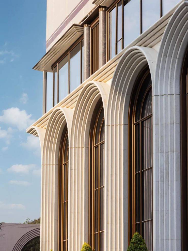 每一层挑檐都用仿石铝板叠加出9层折面,建筑四角以仿石铝板罗马立柱支撑,每根都雕出三段式结构,精致得像是一件艺术品。