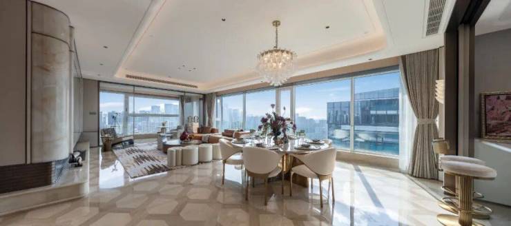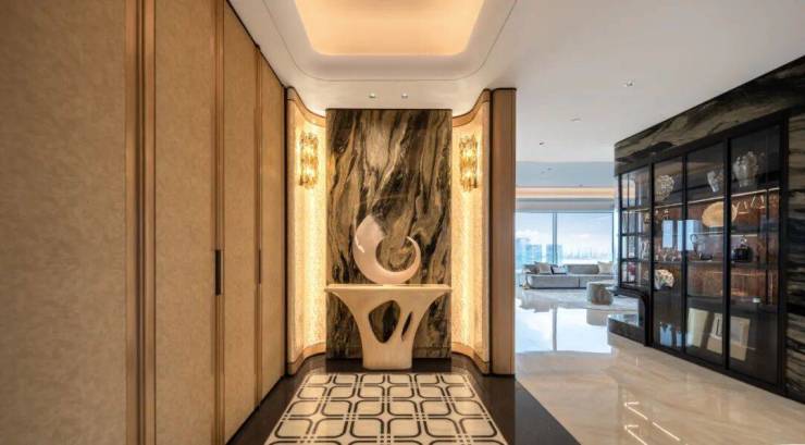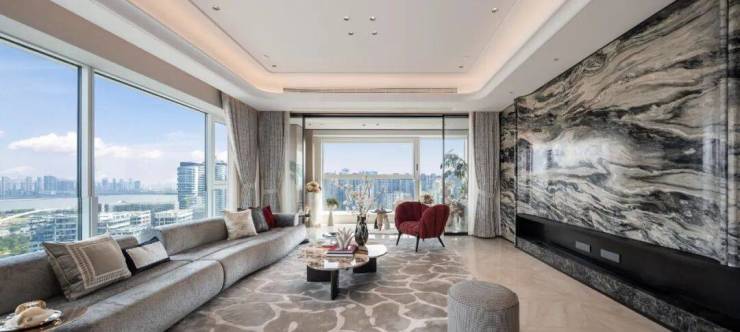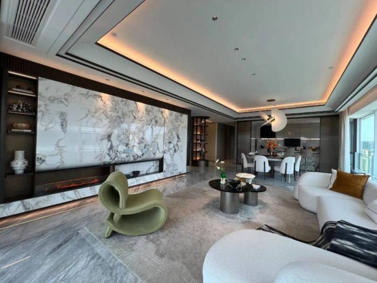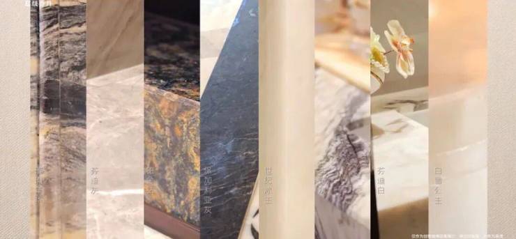 步入样板房内,目之所及,遍布多种玉石 卡里冰玉,世纪冰玉、红花冰玉、白雪公主、芬迪白、喜马拉雅灰、雪山蓝等名贵奢石+天然贝母等,将“奢华”二字堆砌得恰到好处;