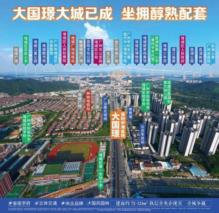 保利中海金地大国璟项目位于广州市增城区钟岗板块,紧邻执信中学增城实验学校(小学部),直线距离仅约100米。