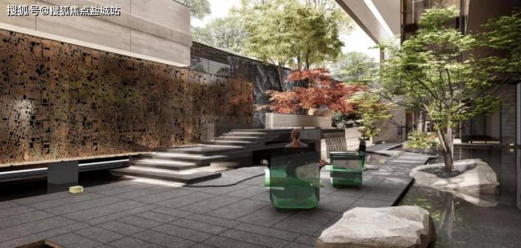 比如下沉庭院,臻选并移植黑松到庭院之内,辅以龙鳞地面铺装,营造《松林龙蜕》诗内老松虬枝苍劲,如龙盘踞的意境。同时以山石层叠、高低景墙和坡度草坪创作一个可容纳小型沙龙的环形聚落,再现《九峰环翠》的山石意向。