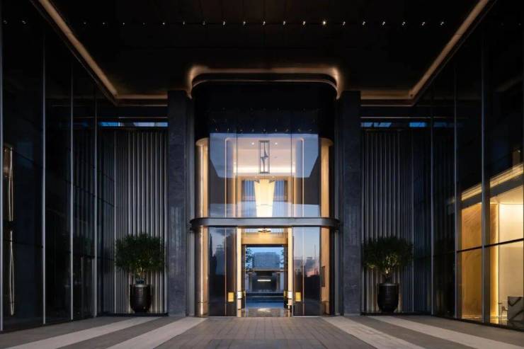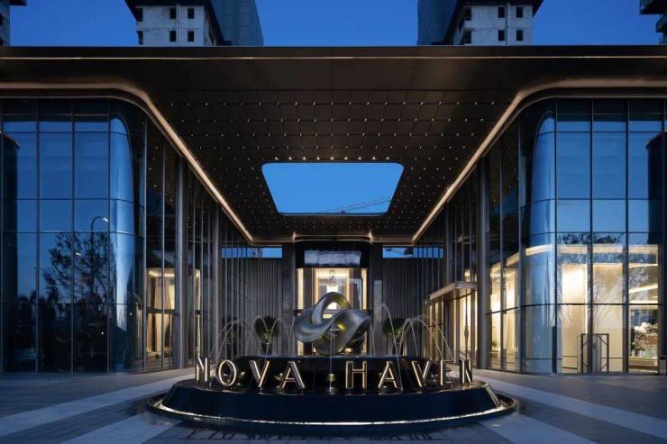 约368㎡泛星门庭,对标五星级酒店落客标准。珍稀植物沿弧形动线舒展,爱马仕灰仿石砖与香槟铝板经弧形切面工艺,碰撞出高级质感。“四水归堂”现代设计,顶部定制铝板复刻传统坡顶形制,寓意“聚财守业”;中庭“华之心”雕塑,采用安哥拉黑整石定制工艺,以流畅弧面诠释匠心底蕴,让归家首重仪制满载尊崇。