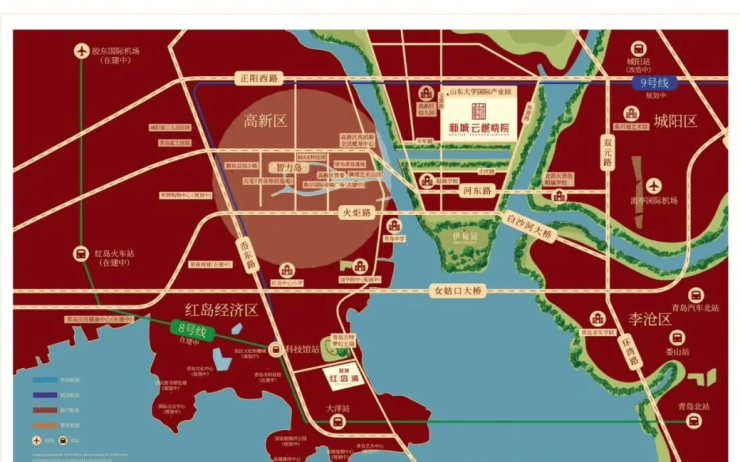 交通:项目周边拥有三维立体交通网络,三横三纵,分别是三横正阳西路、火炬路、胶州湾大桥;三纵岙东路,双元路、青银高速。四通八达,打造青岛中央社区半小时核心生活圈。地铁规划2条线路M8、M9号线。(地铁M8号线起自五四广场,终点至胶州北站。地铁M9号线路起自城阳区红岛街道,止于崂山区王哥庄街道)目前8号线为在建工程,9号线为规划线,其中规划的9号线在晓阳社区站可换成8号线,通达全城;距离红岛高铁站(建设中)约14公里,2个小时通达省内、3小时可至北京上海;距山东省首个4F机场胶东国际机场约30公里,新机场为4F机场,按照国际一流标准设计;附近有773、775、776、940、901、902等多条公交线路。