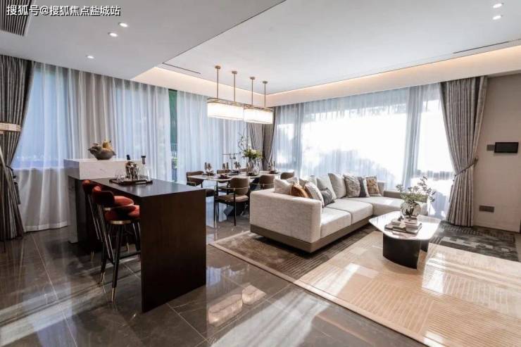 餐客厅空间宽裕,约14㎡的中西双厨房可以满足不同的美食需求,还留出了一个岛台的位置,一边连着餐厅和厨房,一边连着客厅,尺度感、生活情趣兼具。